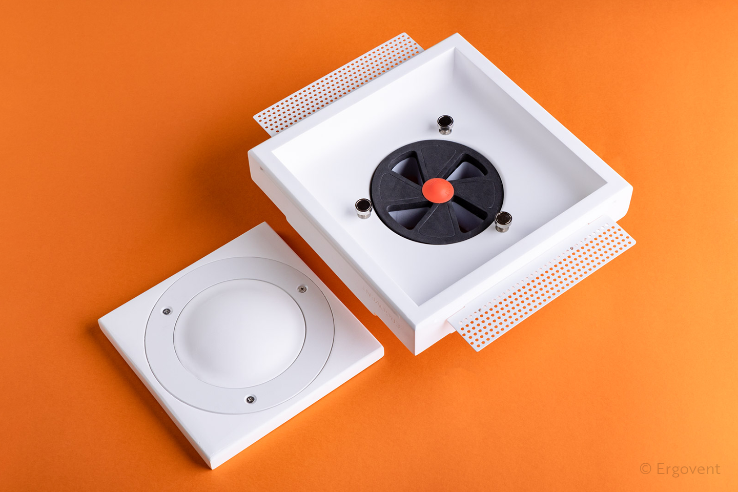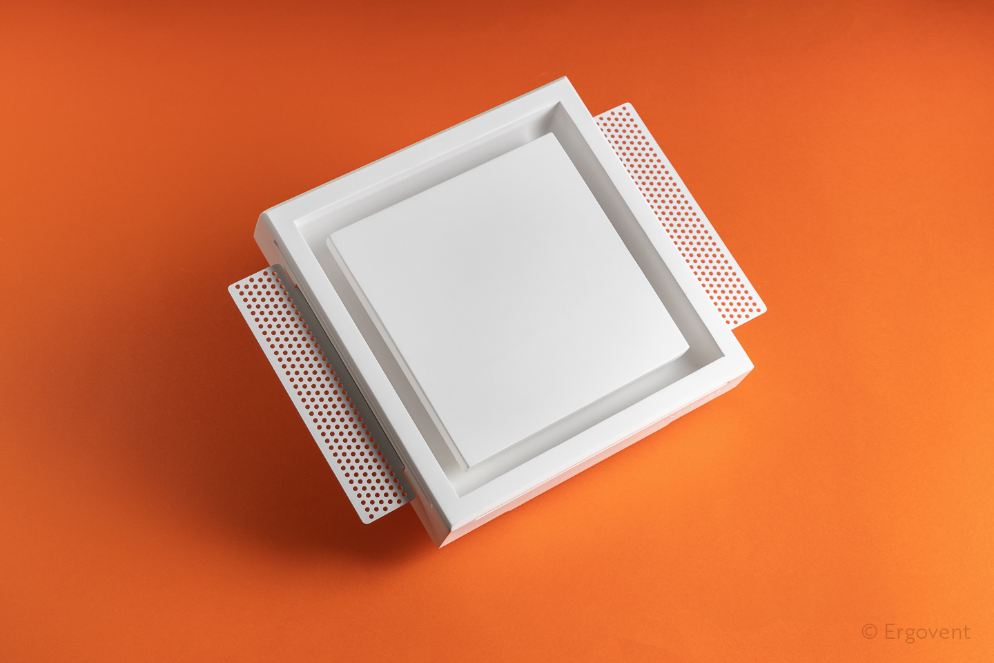 ERGOVENT KVADRO 100 je čtvercový výrobek z řady KVADRO – minimalistický designový ventil pro přívod i odvod vzduchu, určený pro standardní vzduchotechnická potrubí o průměru ⌀ 100 mm. Po montáži do sádrokartonového podhledu nebo přímo do stěny ventil prakticky splyne s povrchem, protože je možné jej natřít stejnou barvou jako okolní materiál.