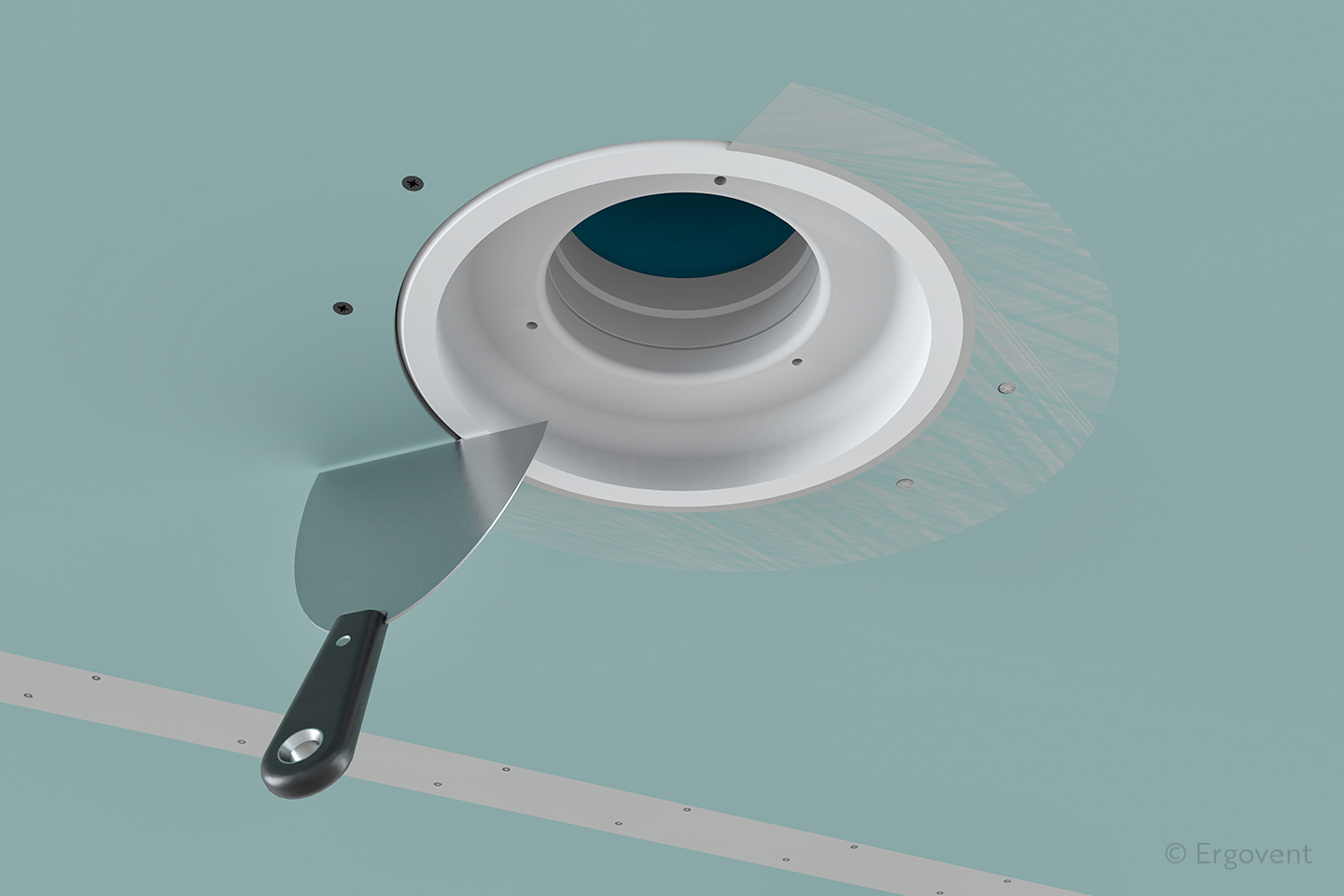 ERGOVENT RONDO 125 je designový sádrový talířový ventil pro přívod i odvod vzduchu, určený pro instalaci do SDK podhledů nebo stěn. Bezrámečkové (zapuštěné) provedení vytváří čistý detail bez viditelných okrajů – po přetření barvou stropu či stěny ventil dokonale splyne s interiérem, viditelná zůstává pouze úzká štěrbina pro proudění vzduchu.