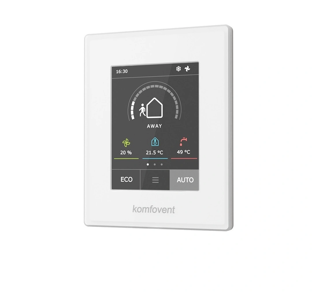 - Integrované funkce pro úsporu energie, jako je intenzita větrání dle kvality vzduchu, regulace výkonu topení/chlazení podle ekvitermní křivky a další.