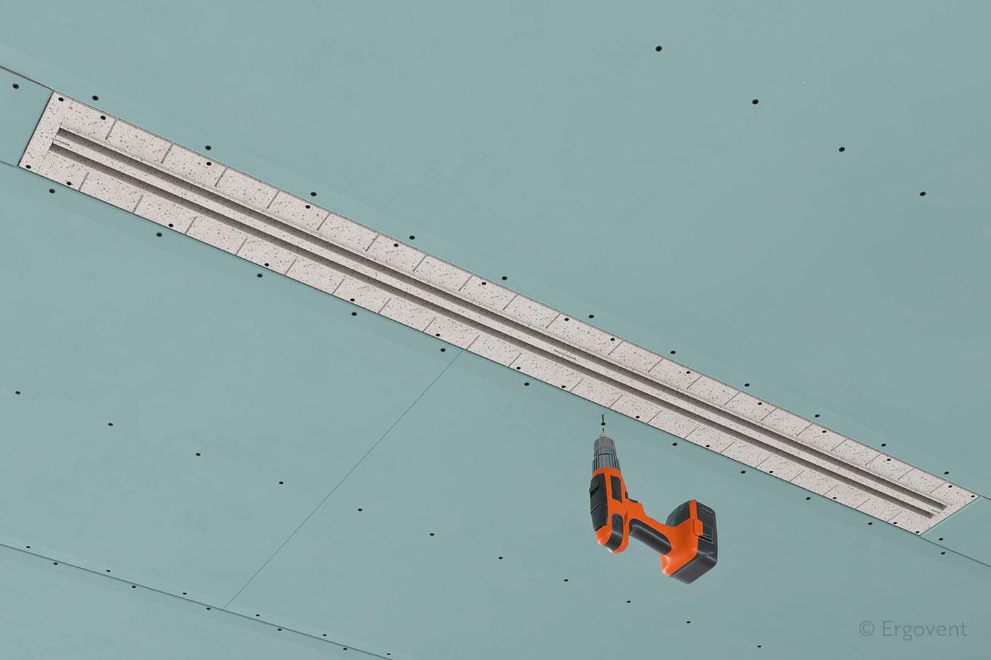Difuzor je určen pro zapuštěnou montáž do sádrokartonového podhledu nebo stěny. Po dokončení instalace a přetření barvou povrchu vizuálně splyne s interiérem – viditelné zůstávají pouze dvě jemné lineární štěrbiny o délce 1000 mm.