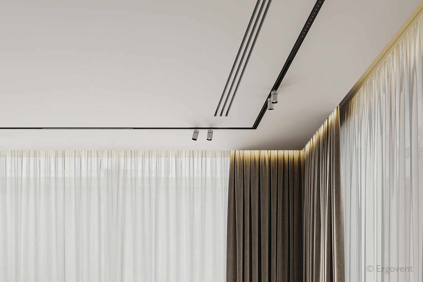Difuzor je určen pro zapuštěnou montáž do sádrokartonového podhledu nebo stěny. Po dokončení instalace a přetření barvou povrchu vizuálně splyne s interiérem – zůstávají viditelné pouze tři jemné lineární štěrbiny o délce 1000 mm.